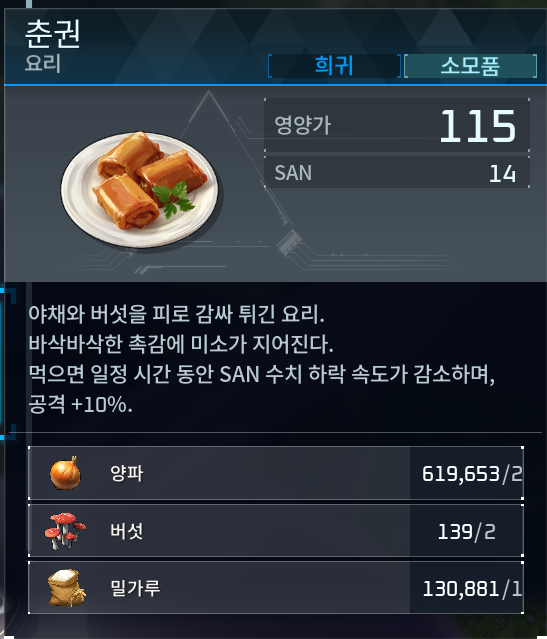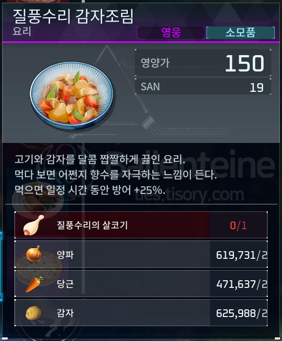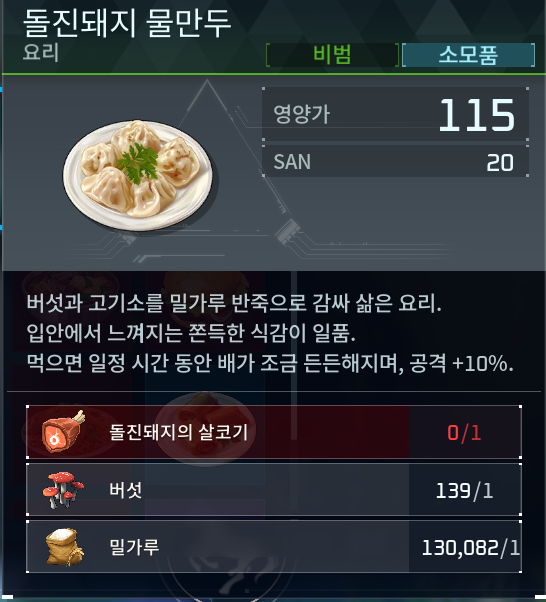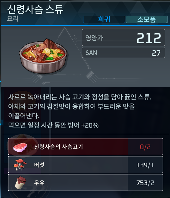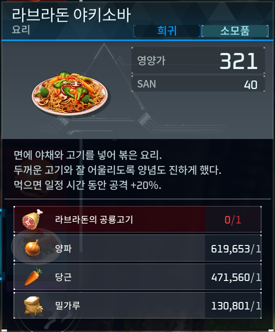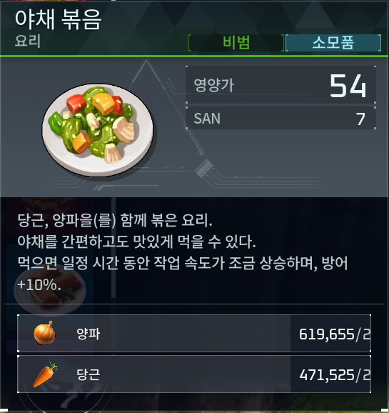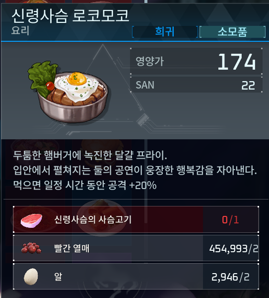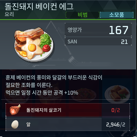 즉, 천락 이전엔 심림의 비경(팰 애호 단체의 탑) 에서 돌진돼지와 질풍수리의 고기를 습득하여, 돌진 돼지 관련 음식을 만들어 사용하고 이후 그린모스 카레로 갈아타면 될 것으로 보인다.