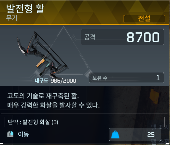 (전설)이상 발전형 활 장전이 없기 때문에 균등한 딜링 가능, 단 활 종류는 부위별 데미지가 있음 (우선 순위 하) |