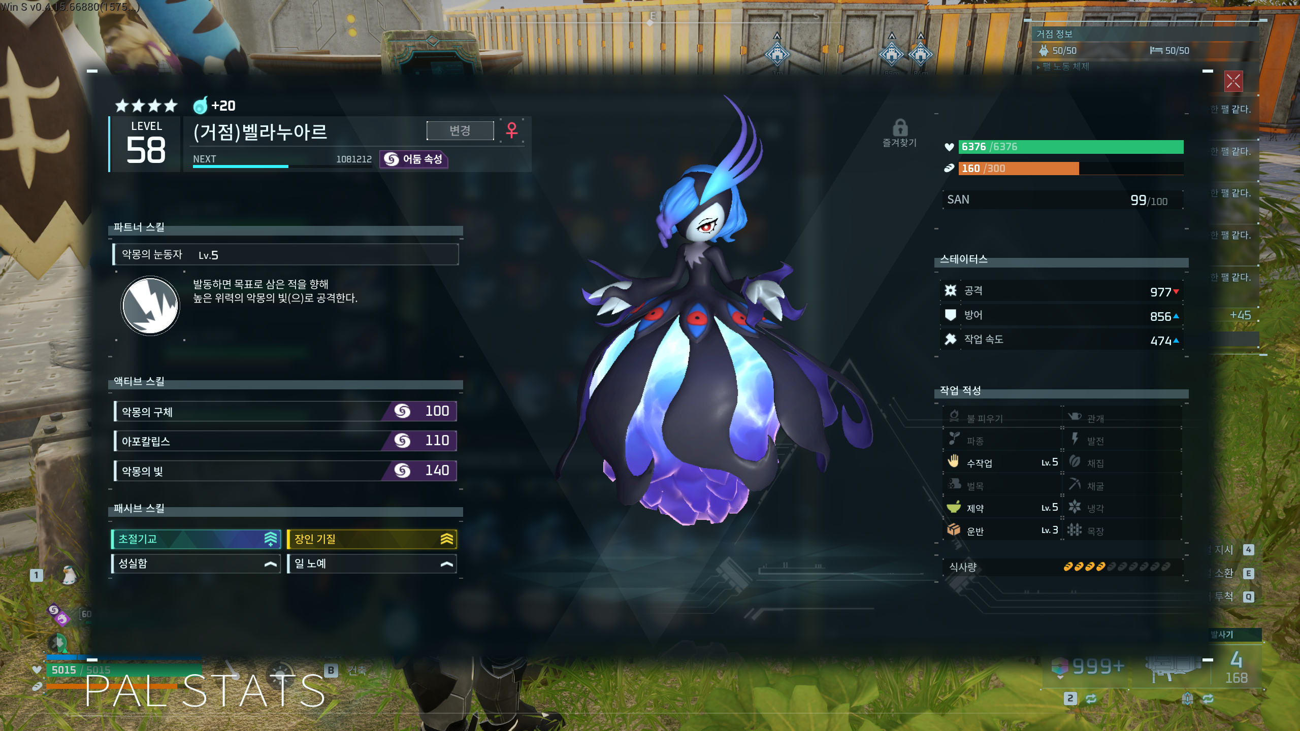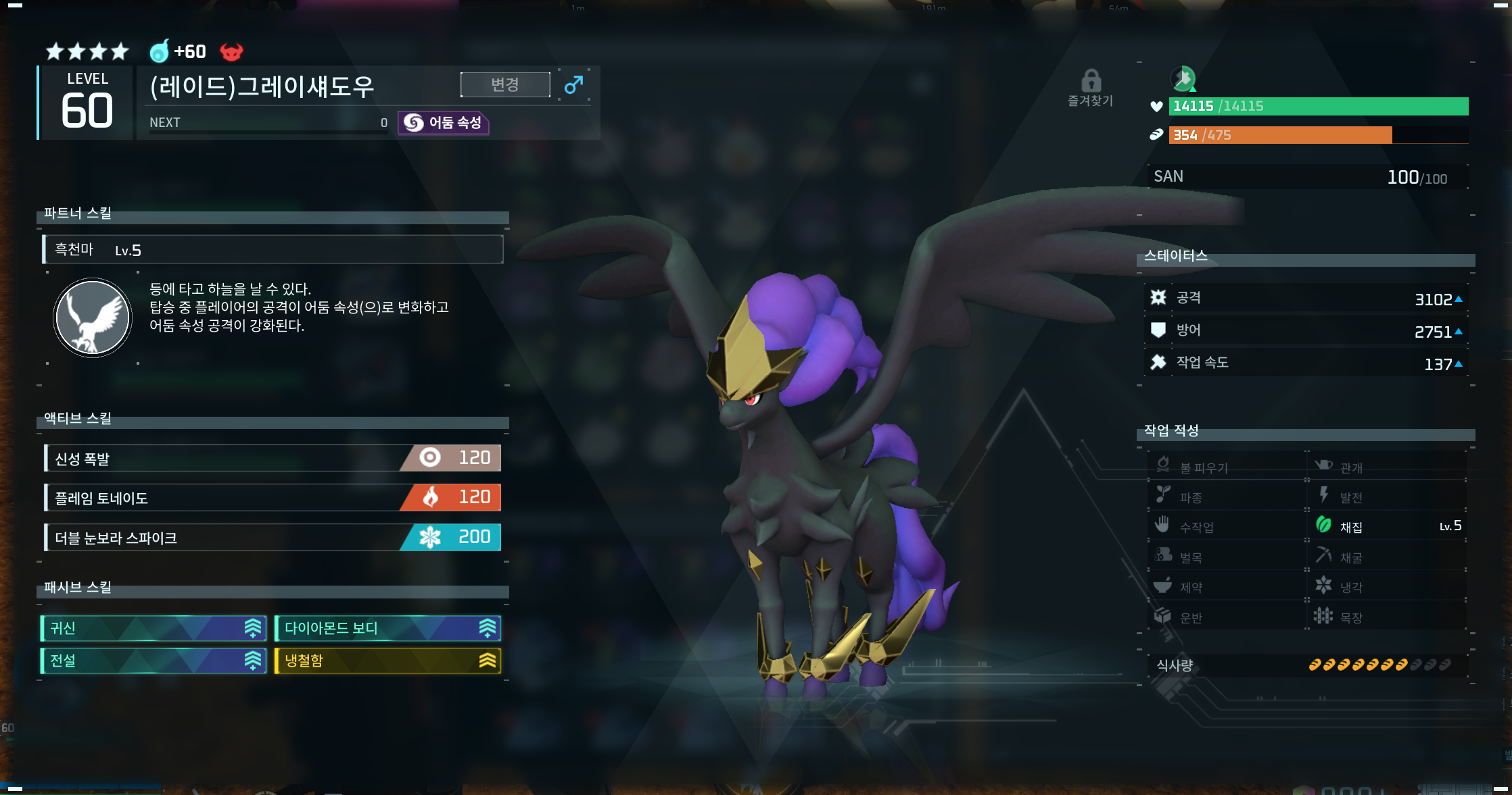 특히 그레이섀도우(흑천마)는 팰월드 내에서 가장 뛰어난 HP를 갖고 있기 때문에 좀더 오래 버티기위해 채택 되었으며,