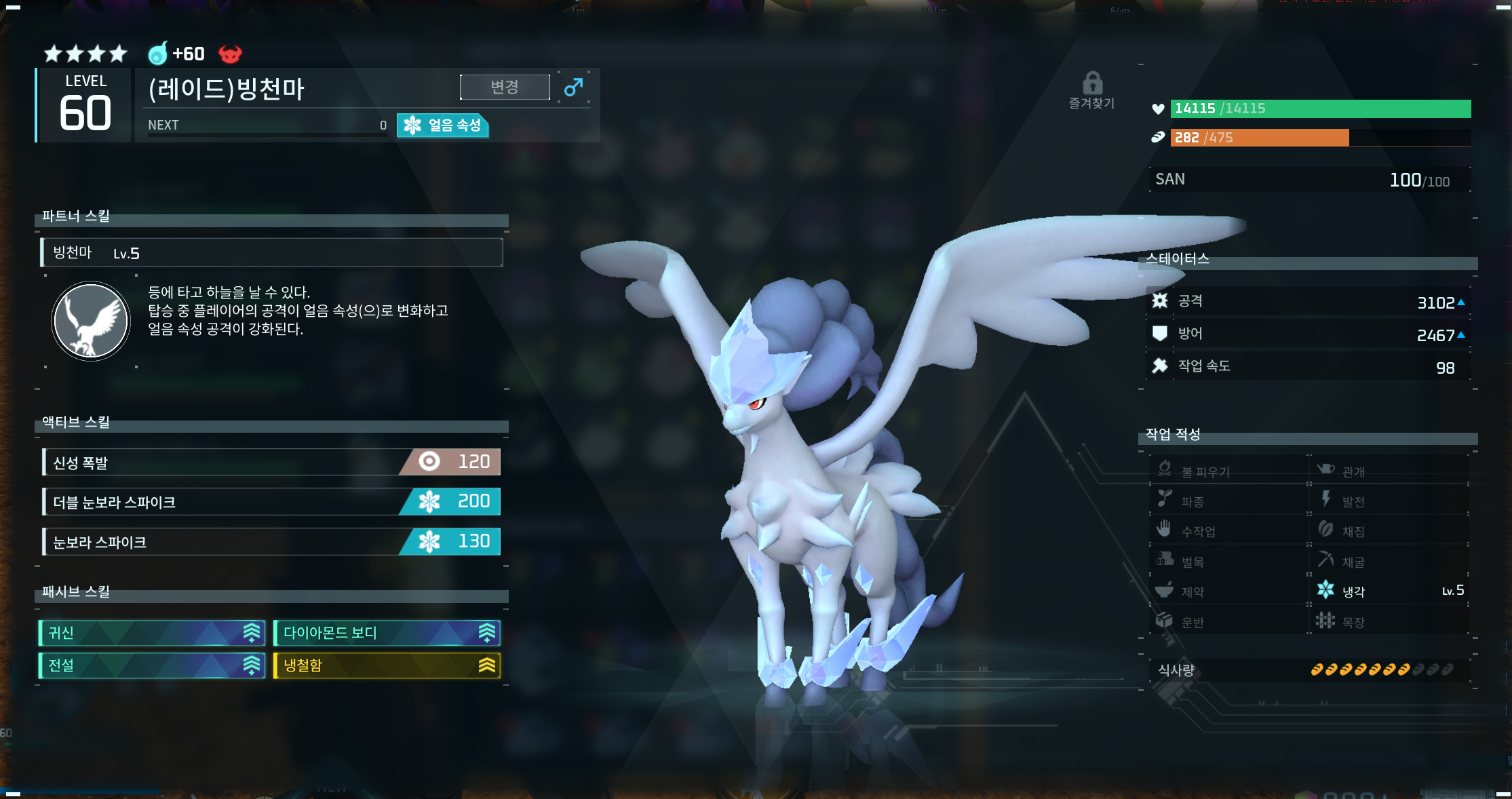 선택 팰들은 속성 불문하고 압도적 체력 및 공격능력을 갖고 있는 빙천마, 그레이섀도우