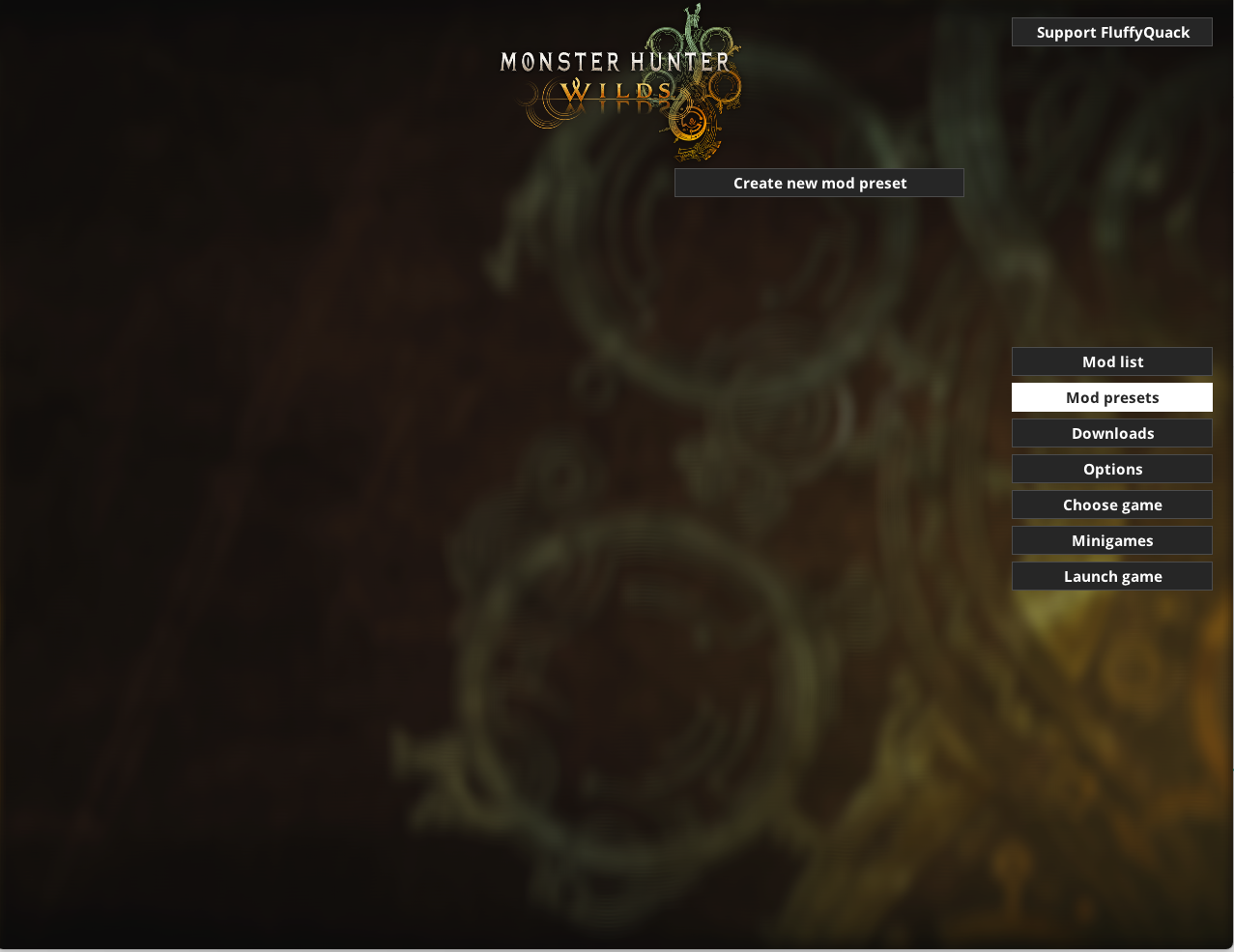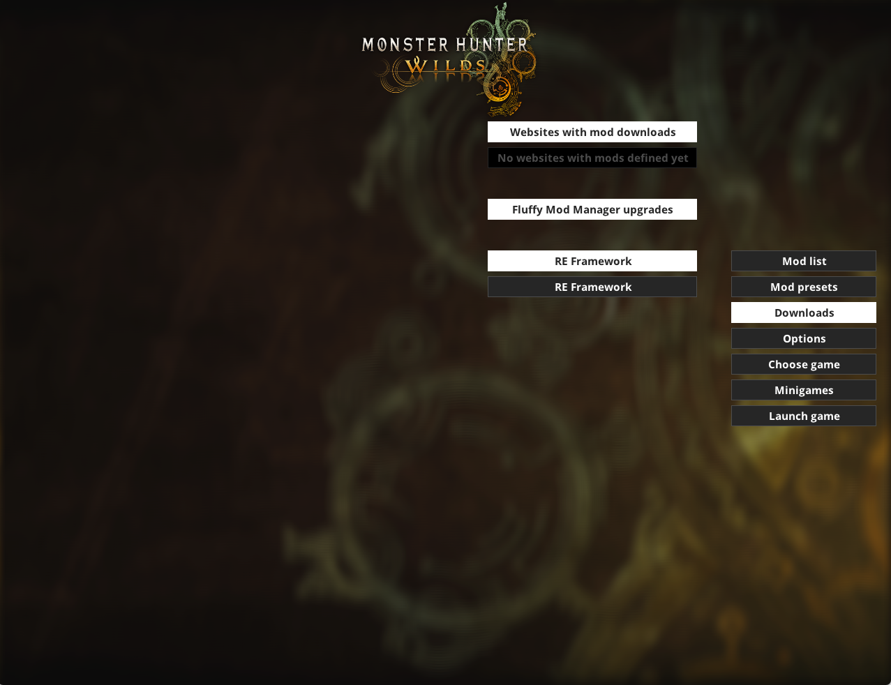 00. Fluffy Mod Manager 실행 시 (만약 몬스터 헌터 와일즈가 잡히지 않는다면, 게임 폴더 찾기 후 몬헌 폴더를 지정)