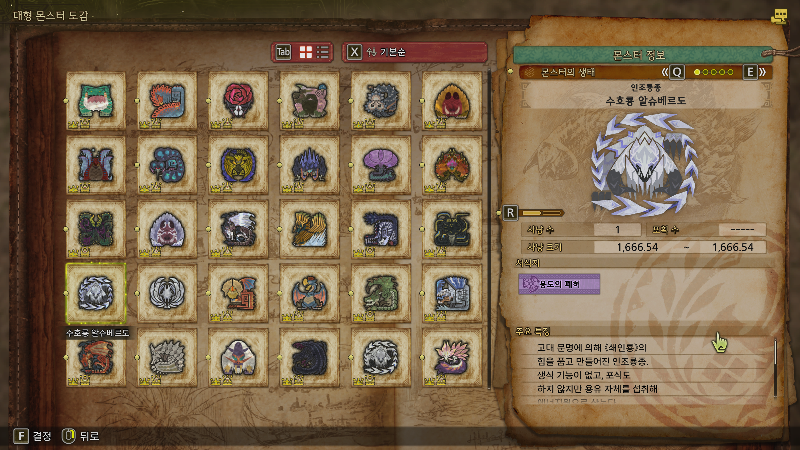 뿐만 아니라 위 레다우, 우드 투나, 누이그드라, 진 다하드는 반드시 50마리 사냥 혹은 포획해야 클리어가 되는 업적이 있기 때문에 (각각 50마리가 아닌, 합쳐서 50마리) 왕관 작이 끝났더라도 50마리 채워서 잡는 것이 좋습니다.