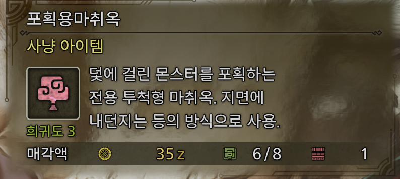 해당 몬스터를 마비덫 (혹은 마비가 통하지 않는 상대에겐 다른 덫) 을 사용하여, 상태이상에 이르게 한 후 포획용 마취옥을 2회 이상 사용하면, 몬스터가 포획 판정이 나며 탐험이 종결 됩니다.