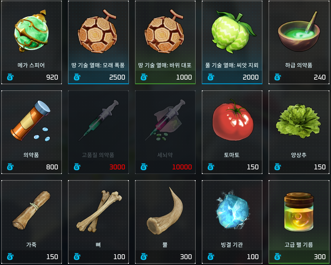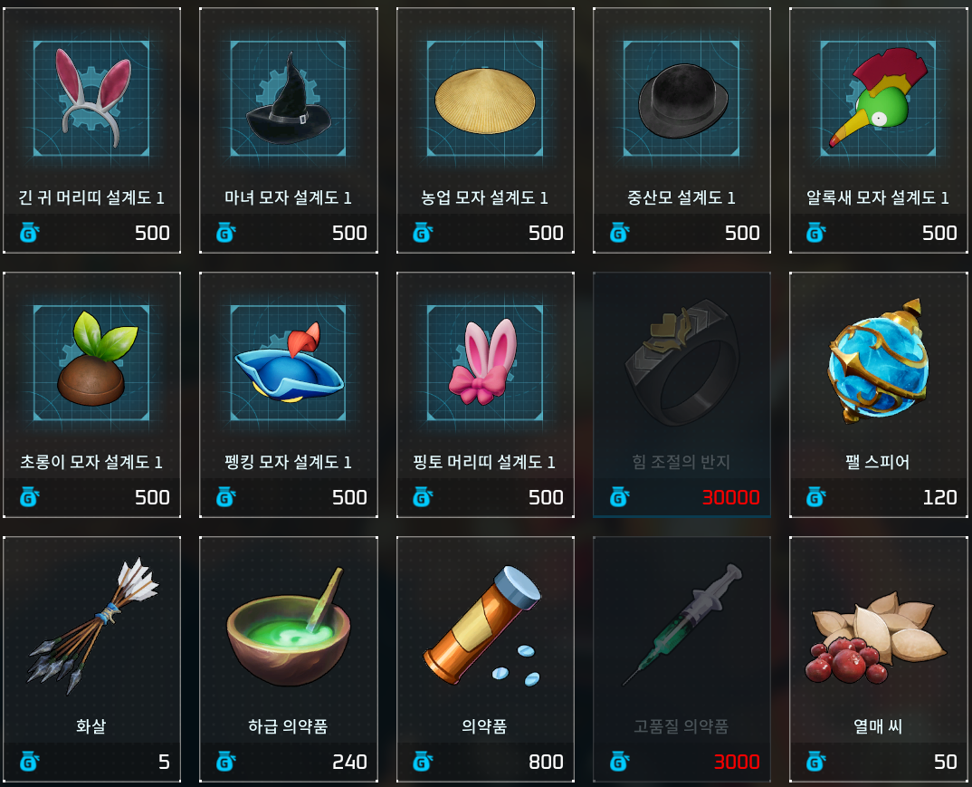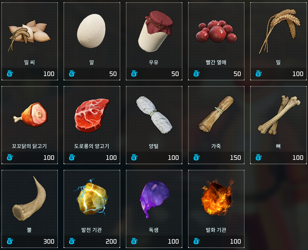 판매 아이템에 관한 리스트는 아래 표에 정리해 두었으니 확인 하시면 좋겠습니다.