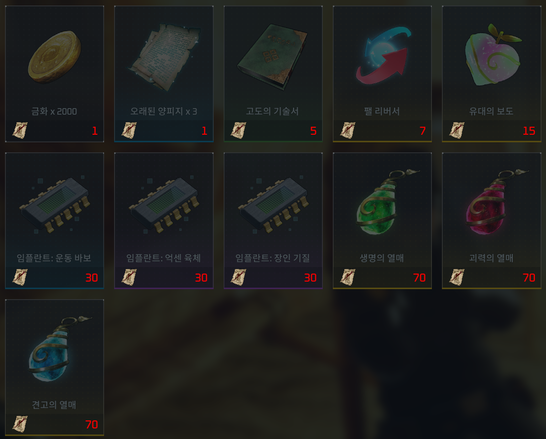 | 셀레문 | 미래의 기술서 * 1 암흑 수류탄 * 6 전자기판 * 2 |