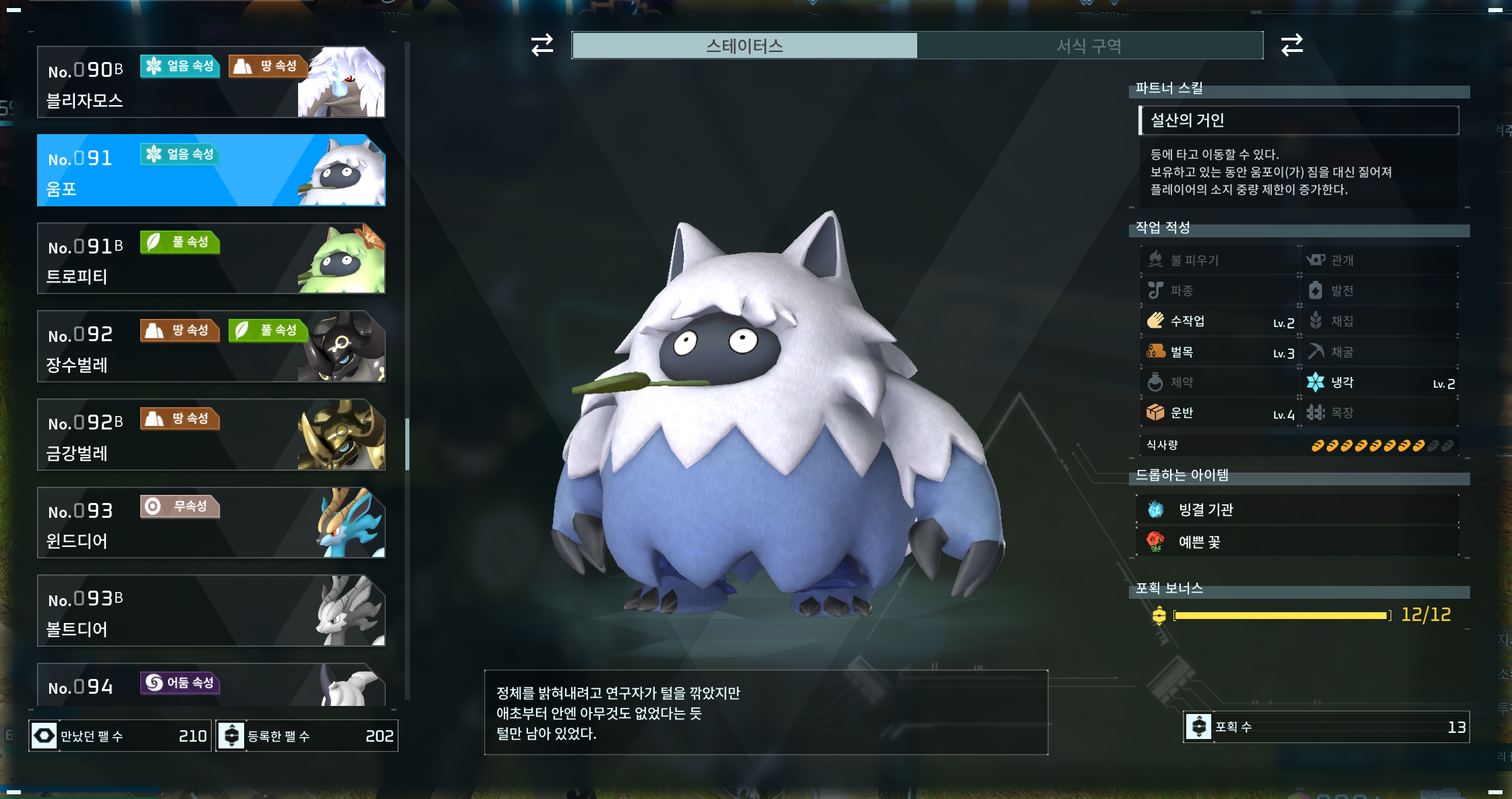 일반적인 개체마다 정해진 식사량이 정해져 있으나 크기가 큰 팰들은 일반적으로 높은 식사량을 갖고 있습니다. (아닌 경우 있음)