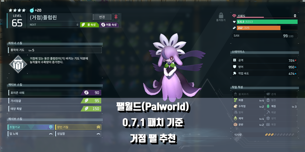 위와 같은 추가점으로 인하여 팰 추천을 "주 작업 + 부 작업"으로 구성되어 있는 팰을 추천드릴 예정이며,